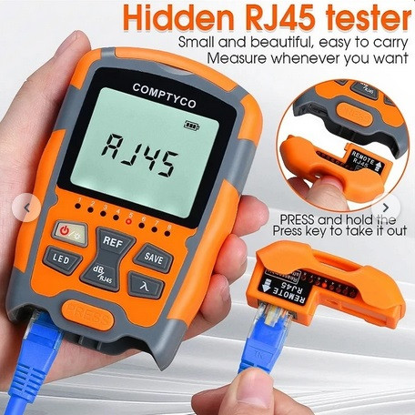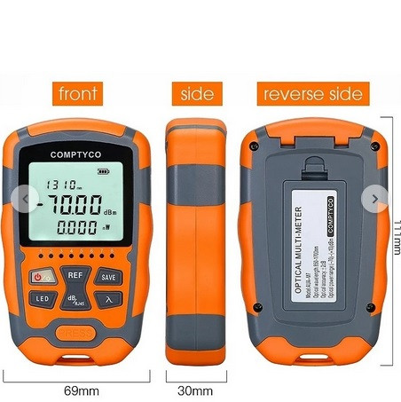 پاورمتر فیبر نوری کامپتایکو مدل AUA-M70 COMPTYCO AUA-M70 4 in1 Mini Optical Power Meter Visual Fault Locator Network Cable Test optical fiber tester 10mw این دستگاه که یک نوع پیشرفته و مجتمع از پاورمیترهای فیبر نوری می باشد دارای مشخصات استاندارد به شرح زیر را دارد. با این پاورمیتر انواع فیبر های نوری سینگل مود و مالتی مود را می توان اندازه گیری کرد و همچنین دارای پورت قلم فیبر نوری نیز می باشد. این دستگاه جهت تست شبکه هم مناسب بوده و با پورت شبکه و ریموت تعبیه شده در آن براحتی تست کابل شبکه راهم انجام می دهد . خاصیت دیگر هم استفاده از نور سفید یا لامپی آن هست که کارایی مکمل تر محصول می باشد. این محصول که به تازگی تولید شده است و توسعه فیبرنوری به عنوان نماینده رسمی محصولات برند کامپ تایکو در ایران می باشد برای استفاده کلیه تکنسین های شبکه و مخابرات و فیبر نوری مناسب می باشد . بجای این محصول کوچک و جمع و جور شما بایستی 4دستگاه جداگانه داشته باشید که هم از لحاظ قیمتی بالاتر هست و هم جابجایی آنها براحتی نیست. این کالا به عنوان کادویی هم به دوستانتان که در حوزه شبکه و فیبر نوری فعالیت می کنند بسیار گزینه مناسبی می باشد.