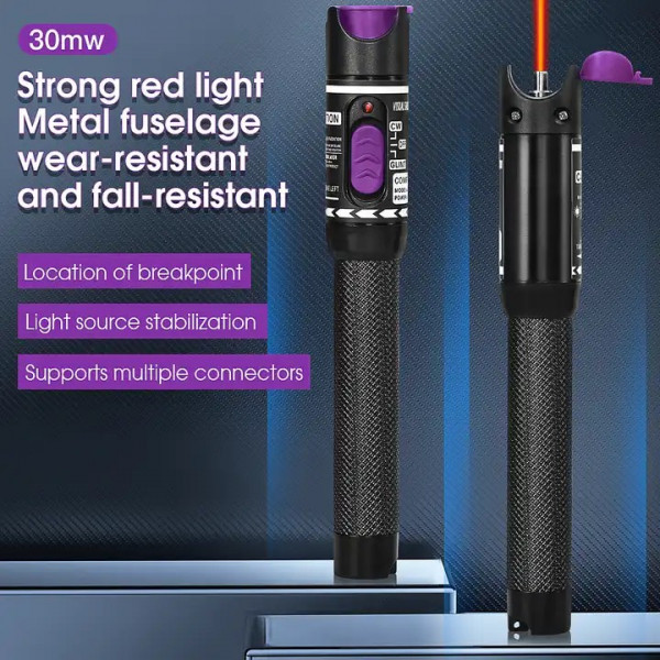 قلم فیبر نوری COMPTYCO AUA H30 مدل جدید و High Quality از قلم فیبر نوری مدل قبلی AUA-30 بوده و در اواخر سال 2021 طراحی و اوایل سال 2022 میلادی وارد بازار گردید و تولید مدل قبلی متوقف گردید . این دستگاه دارای 30mW توان بوده و در فیبر های single mode و multi mode تا فاصله25 تا 30 کیلومتر را براحتی تست میزند. Comptyco AUA-H30 یک برند چینی و باکیفیت مطلوب و ویژگیهای مناسب می باشد.در پک جدید محصول علاوه بر قلم فیبر نوری که دارای کانکتور SC می باشد. با استفاده از این قلم شناسایی فیبر نوری آسان و دقیق می باشد بطوریکه به راحتی و با دقت بالا می تواند شکاف های فیبر ، اتصالات ضعیف ، خم شدن یا ترک خوردگی را تشخیص دهد و همچنین ردیابی فیبر ، شکستن یا گسل موجود در فیبر را از طریق نور شفاف 650 نانومتر ر ا امکانپذیر می سازد. از دیگر ویژگیهای Comptyco AUA-H30 این قلم فیبر نوری CRASH-PROOF , DUST-PROOF DESIGN بودن آن می باشد که به ترتیب ضد گرد و غبار و مقاوم بودن در سقوط یا از دست افتادن آن می باشد. سر قلم فیبر VFL از فولاد ضد زنگ تقویت شده ساخته شده و بدنه آن فلزی واز فلز آلومینیوم ساخته شده است تا بتواند در برابر ضربه مقاوم پذیر باشد و از آسیب پذیری ESD جلوگیری کند.